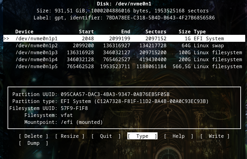 First create a boot disk for the efi boot loader remember /efi must be formatted in fat32 or vfat do not use ntfs Reallocate around 1gb disk space for your boot drive select Type in cfdisk and choose EFI System For the swap drive it is recommended to double the size of RAM. i have 32gb of ram so 64gb disk-space for the swap drive. Select Type in cfdisk and choose Linux Swap Reallocate around 100gb for the root drive / Please note that the layout can look different from mine since I have not installed Windows this time. Reallocate the rest of the disk space for /home this is where your user directory is going to be it needs the most space when done select write and type yes to confirm. Now you have to format your hard drives . check the config with fidsk -l or lsblk  #Make the swap mkswap . note that on SSD or HDD it the command will be mkswap /dev/sda2 instead.